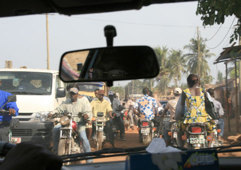 11.02.2011 Lomé: Die Fahrt zwischen Flughafen und Hotel war wie üblich chaotisch. Sie führte durch enge sandige Gassen vorbei an zum Teil kleinen Blech- und Holzhütten. Schließlich kamen wir zu einem Ferienhotel der Güte 'Lanzerote mit Palmenanlage' und außerhalb des Hotelgeländes mit einem Strand am Atlantischen Ozean. Kurz vor dem Abendessen beschlossen wir, auch den nächsten Tag hier in der Anlage zu bleiben. Wir wollten endlich alle Berichte nachholen und vor allem auch einmal wieder ordentlich schlafen.